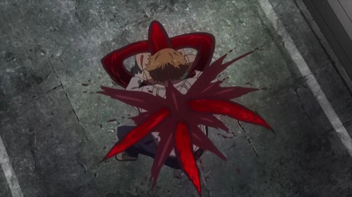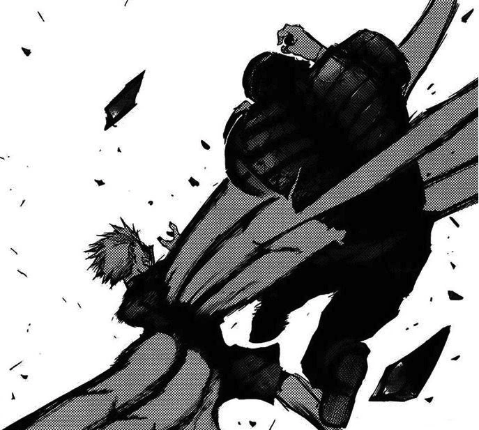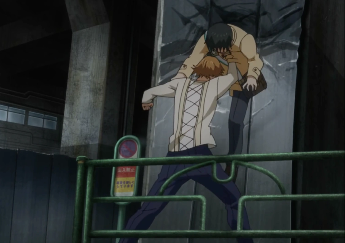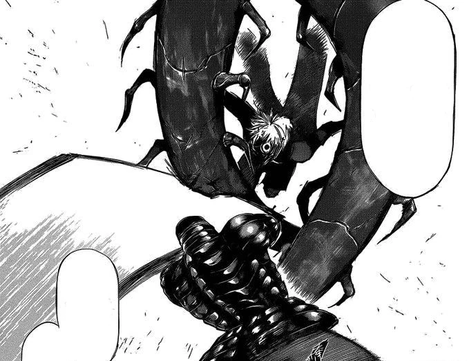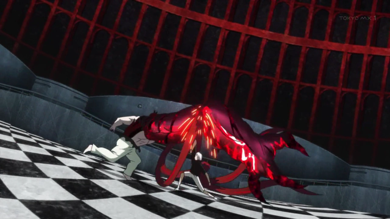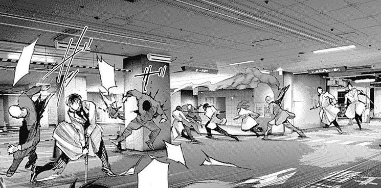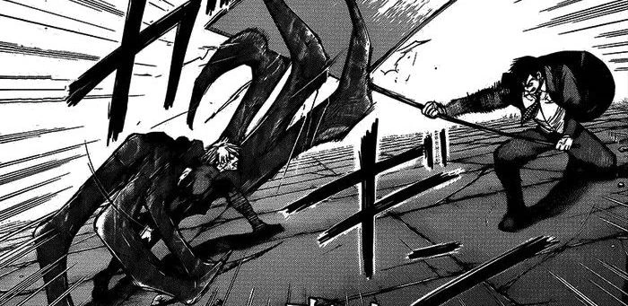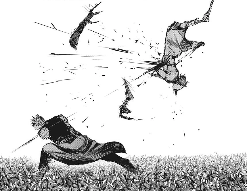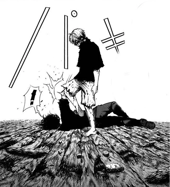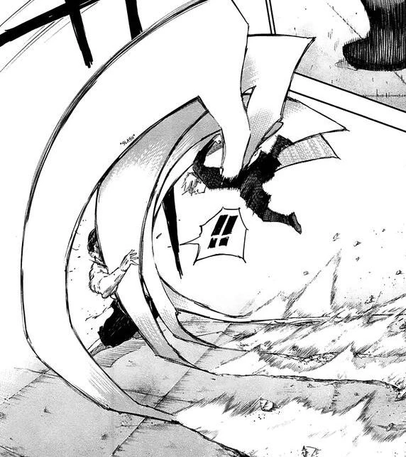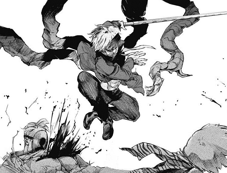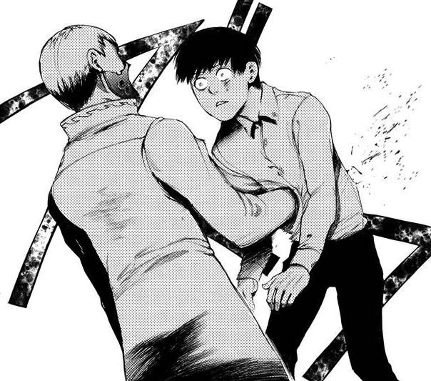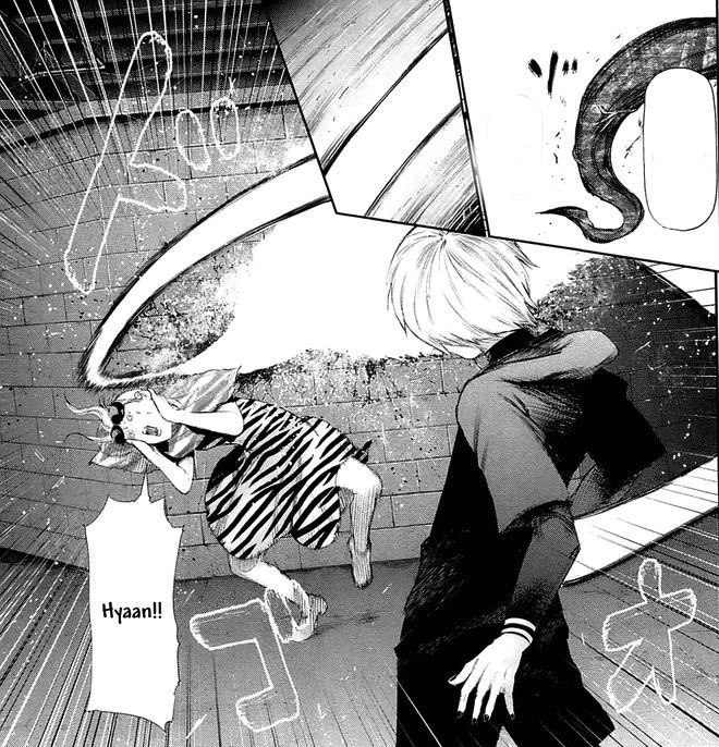 A peine recommence-t-il sa course que le kagune de la goule lui transperce un rein. Souffrant énormément, le pauvre Ken est plaqué contre un mur pendant que son prédateur se rapproche impitoyablement de lui. Mais cette scène se trouve brutalement interrompue par une chute de poutres métalliques écrasant Lize sous leur poids et sauvant Ken in extremis.
