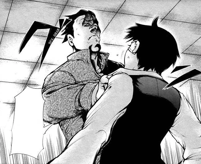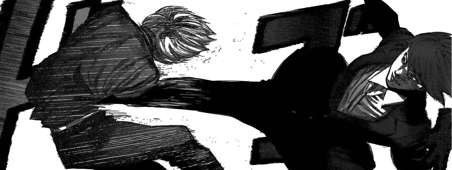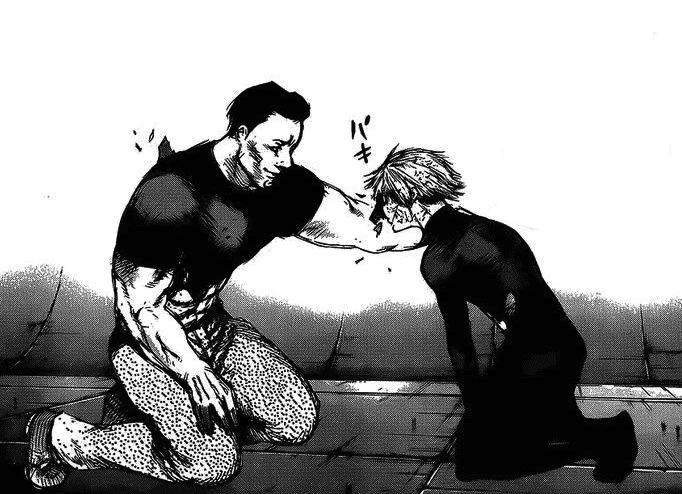 Ken, blessé, entre dans une grande rage en refusant de voir son meilleur ami maltraité aussi violemment. Il se lève et jette son sac sur Nishiki qui l'évite. La goule attrape alors Ken et lui donne un puissant coup de pied qui le fait s'envoler, en le traitant de femme pour s'être battu avec un sac. Ken peine à se relever, il se retrouve à genoux à écouter Nishiki parler. La goule lui demande s'il aime "faire ami-ami avec du bétail".