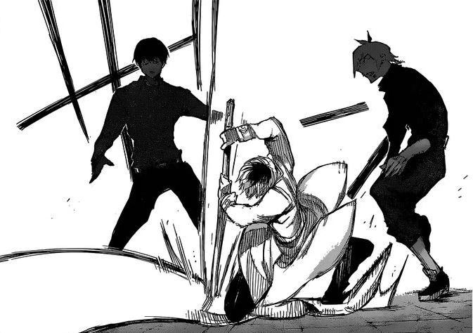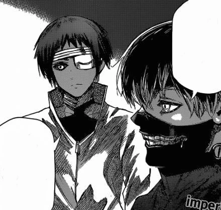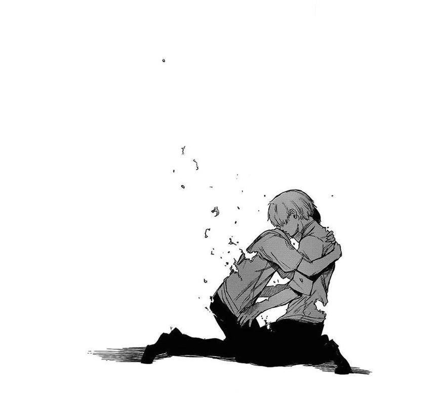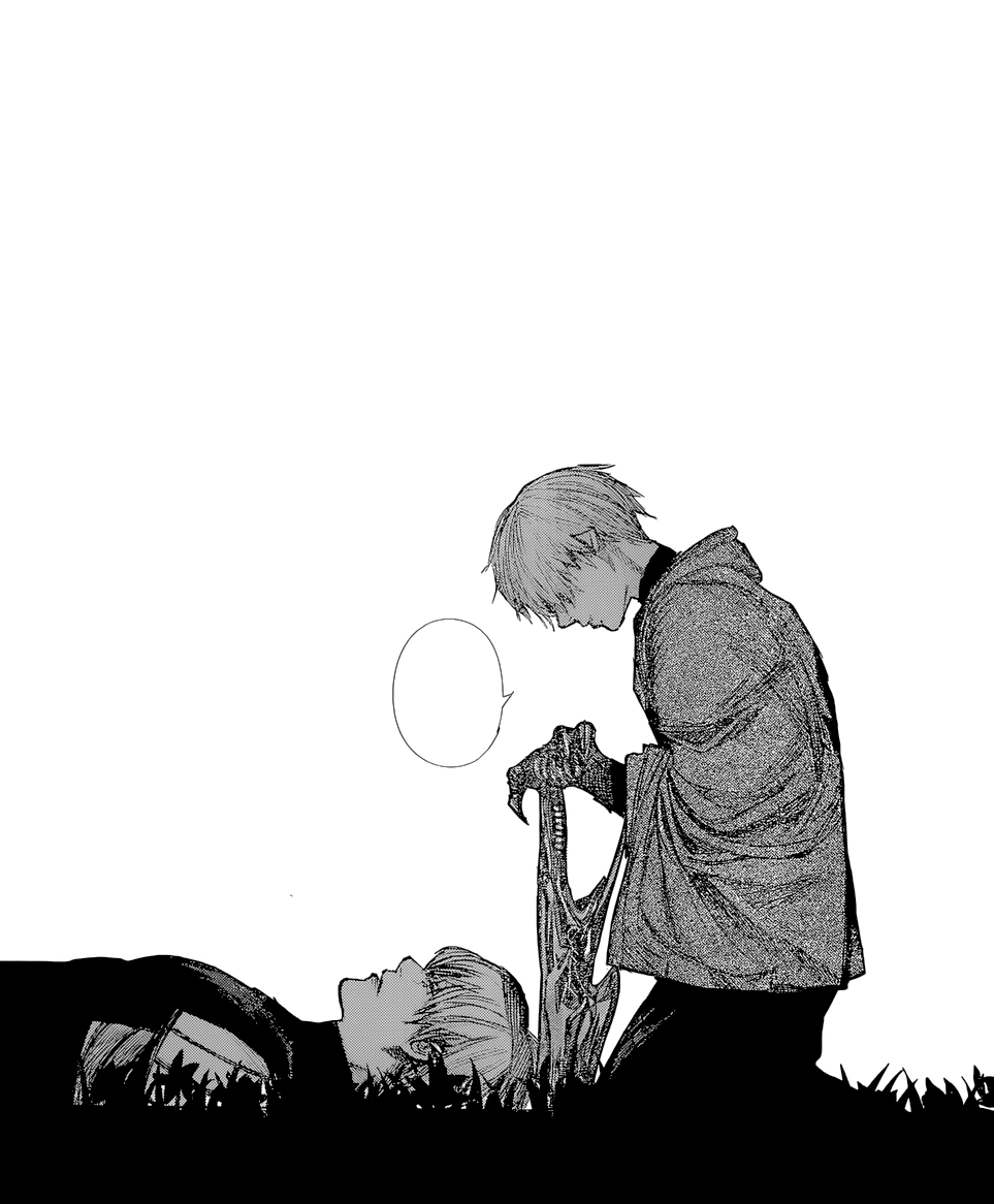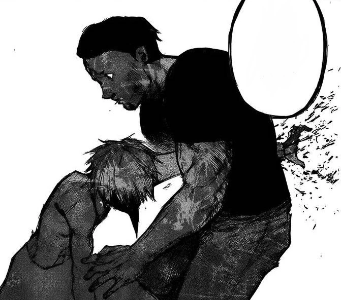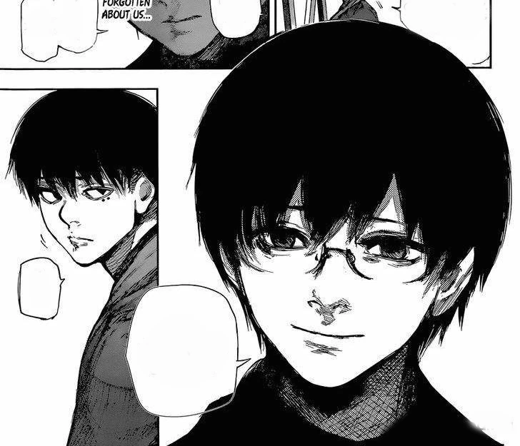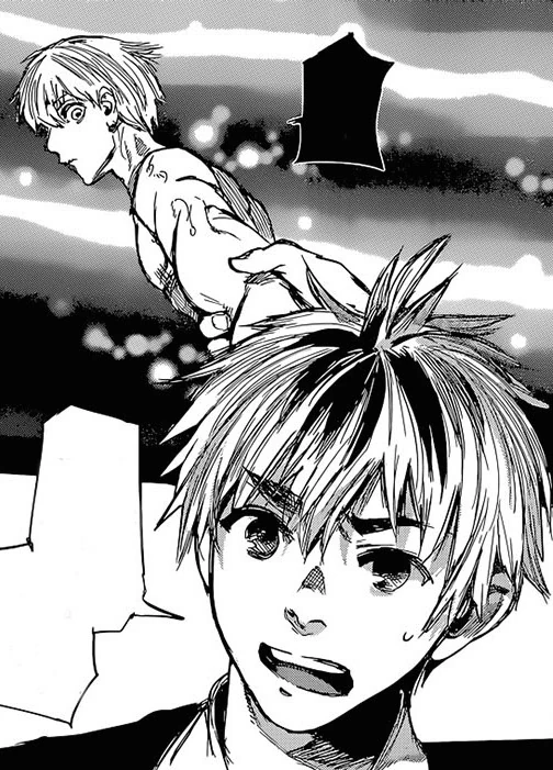 Nishiki dévoile alors son kagune et frappe Ken avec, le faisant voltiger et s'écraser près d'Hide. Nishiki s'approche de Ken pour le tuer quand il se fait arrêter par Hide, semblant inconscient, qui a levé son bras. Voyant ça, Nishiki décide de tuer Hide sous les yeux de Ken. Celui-ci se lève avec peine mais ne peut tenir debout, crachant du sang en s'écroulant à terre. Toute sa vie, son enfance et les moments qu'il a partagés avec Hide refont surface et défilent devant lui. Ken, ne pouvant laisser son ami mourir, se répète en boucle qu'il n'est pas question qu'Hide soit tué.