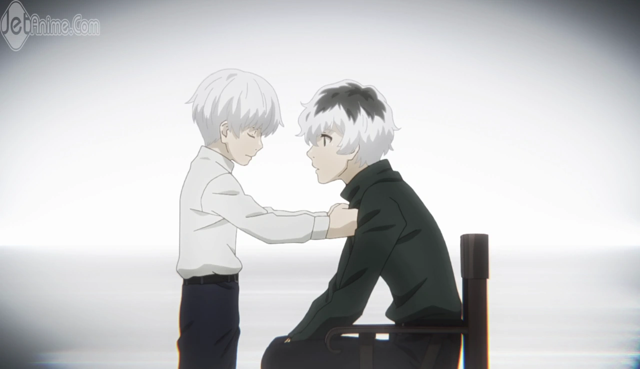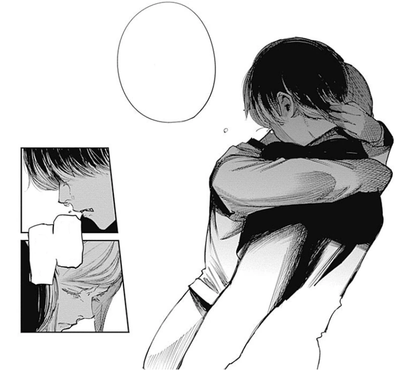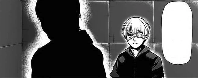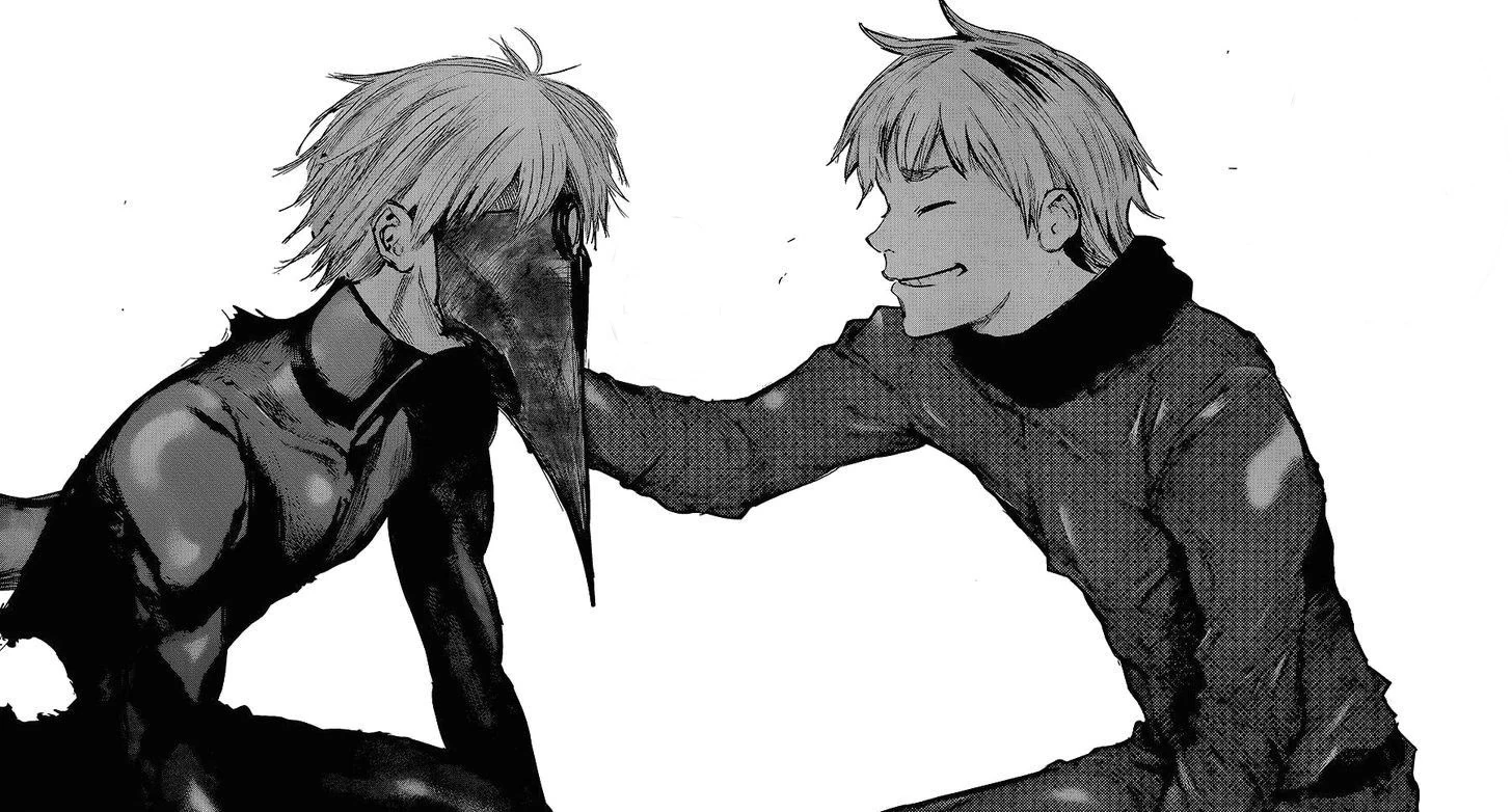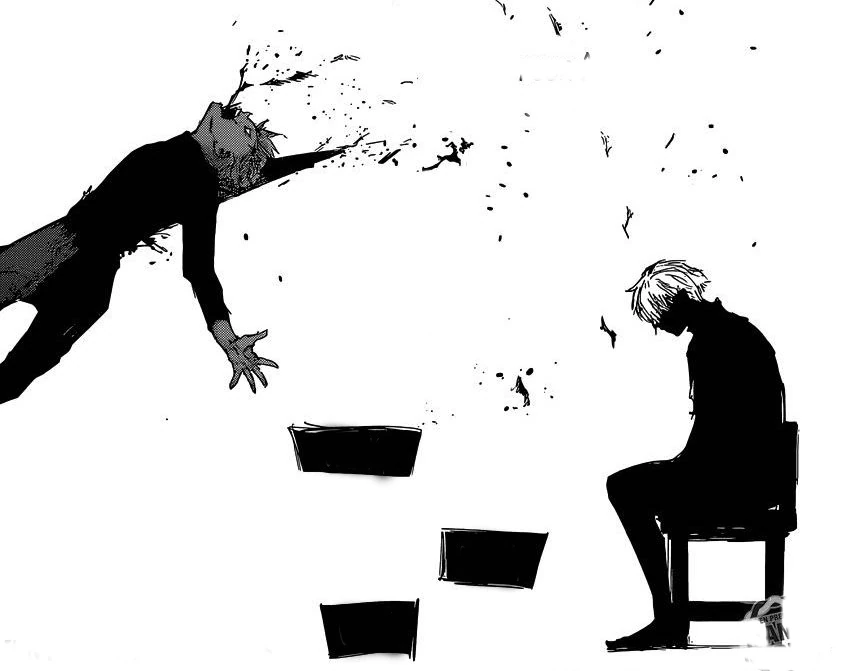 Nishiki dévoile alors son kagune et frappe Ken avec, le faisant voltiger et s'écraser près d'Hide. Nishiki s'approche de Ken pour le tuer quand il se fait arrêter par Hide, semblant inconscient, qui a levé son bras. Voyant ça, Nishiki décide de tuer Hide sous les yeux de Ken. Celui-ci se lève avec peine mais ne peut tenir debout, crachant du sang en s'écroulant à terre. Toute sa vie, son enfance et les moments qu'il a partagés avec Hide refont surface et défilent devant lui. Ken, ne pouvant laisser son ami mourir, se répète en boucle qu'il n'est pas question qu'Hide soit tué.