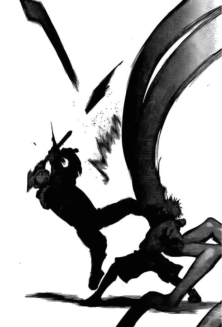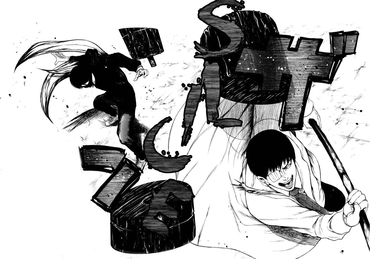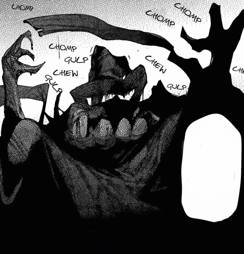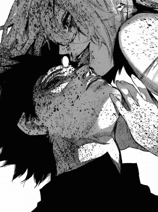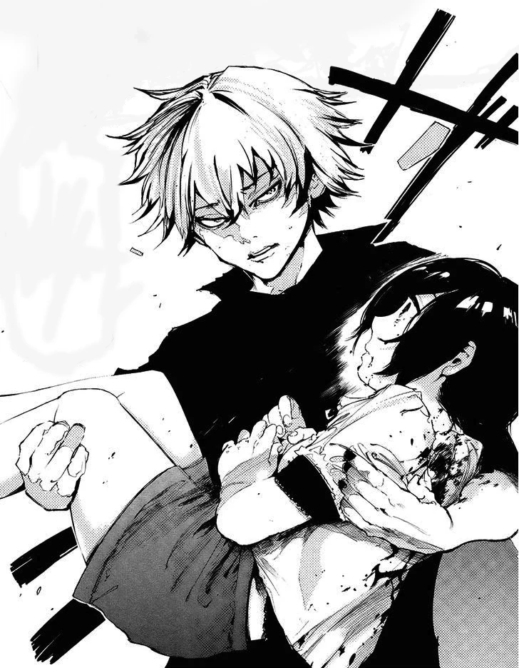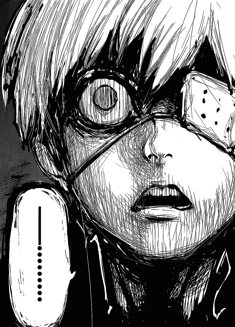 Ken est alors submergé par la faim et perd le contrôle de son corps. Il voit alors Hide comme de la nourriture et décide de le manger. Toka apparait alors et le regarde, alors qu'il est complètement fou et possédé par la faim. Elle décide donc de l'aider juste cette fois et dégaine son kagune.