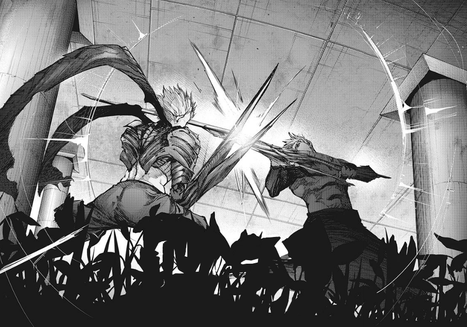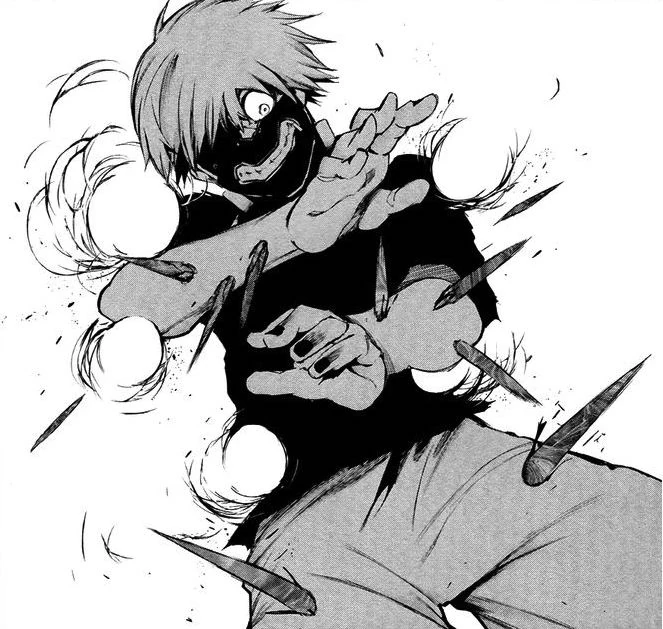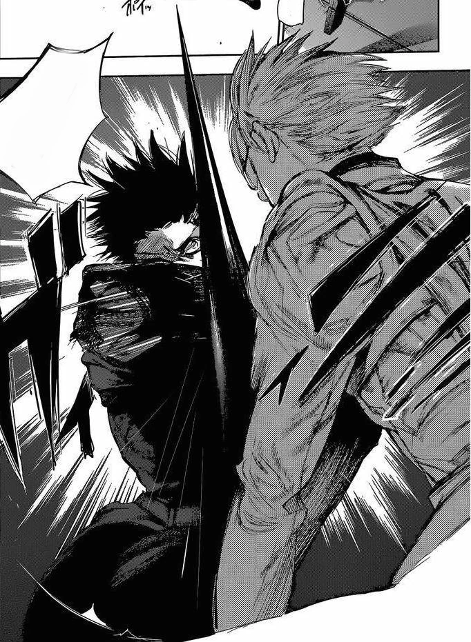 Ken se relève finalement et, pour la première fois, libère son kagune écailleux qui prend la forme de trois tentacules, comme celui de Lize Kamishiro. Il s'élance sur son ennemi qui l'attaque avec son kagune mais ses tentacules le protègent. Ken aggrippe alors Nishiki et le transperce avec ses trois tentacules. Il recommence frénétiquement jusqu'à ce que Nishiki se mette à crier qu'il va mourir si Ken n'arrête pas. Ken le jette alors violemment, le faisant s'écraser ailleurs.