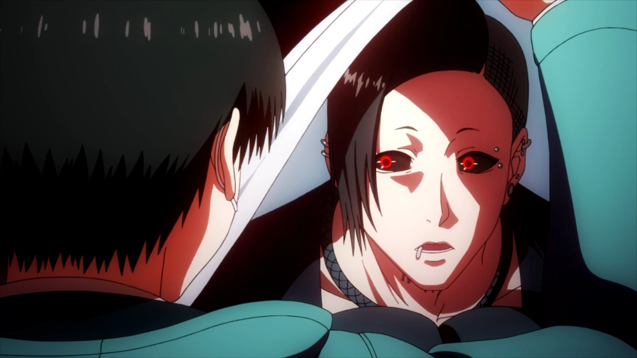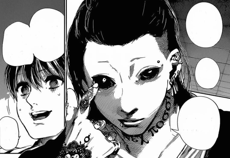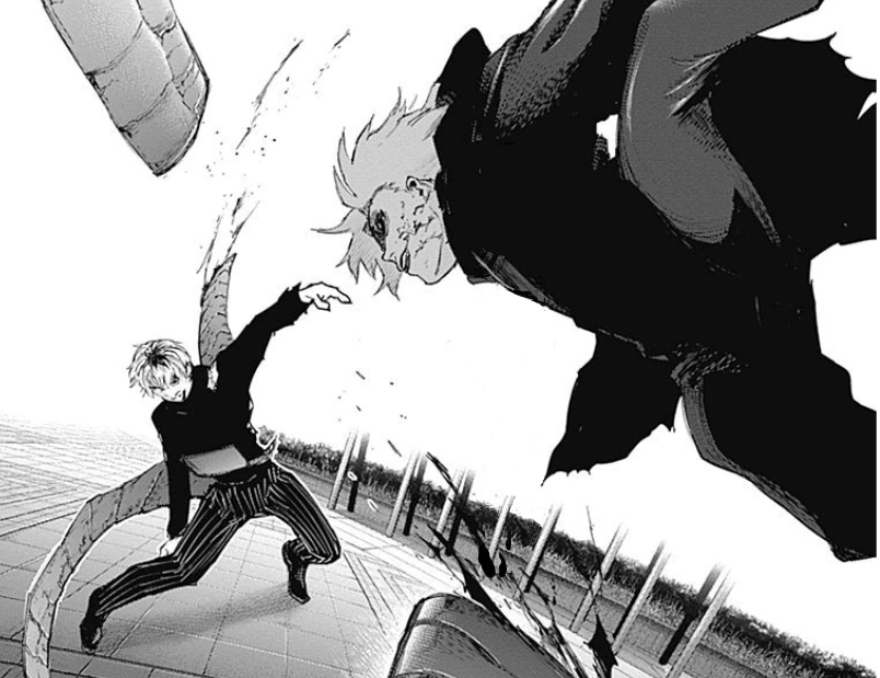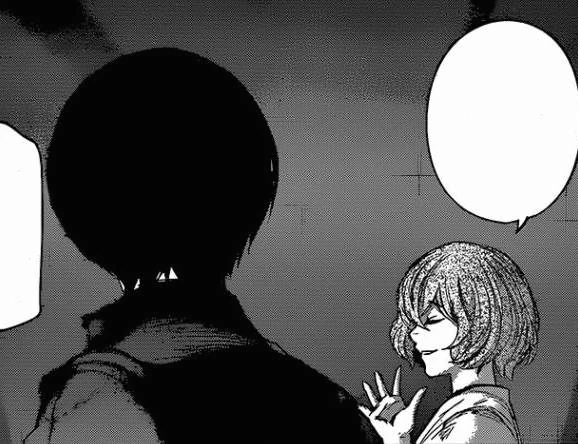Cette goule est beaucoup plus agressive et plaque Ken contre un mur, le tenant à la gorge. Nishiki lui dit alors qu'il est sur son terrain de chasse. Il ajoute que le fait que Ken n'ait qu'un oeil est dégoûtant. Toka apparaît et lui répond donc que ce n'est pas son terrain de chasse, mais celui de Lize et que, comme cette dernière est morte, il faut laisser l'Antique se charger de la répartition des terrains de chasse pour les goules les plus faibles.