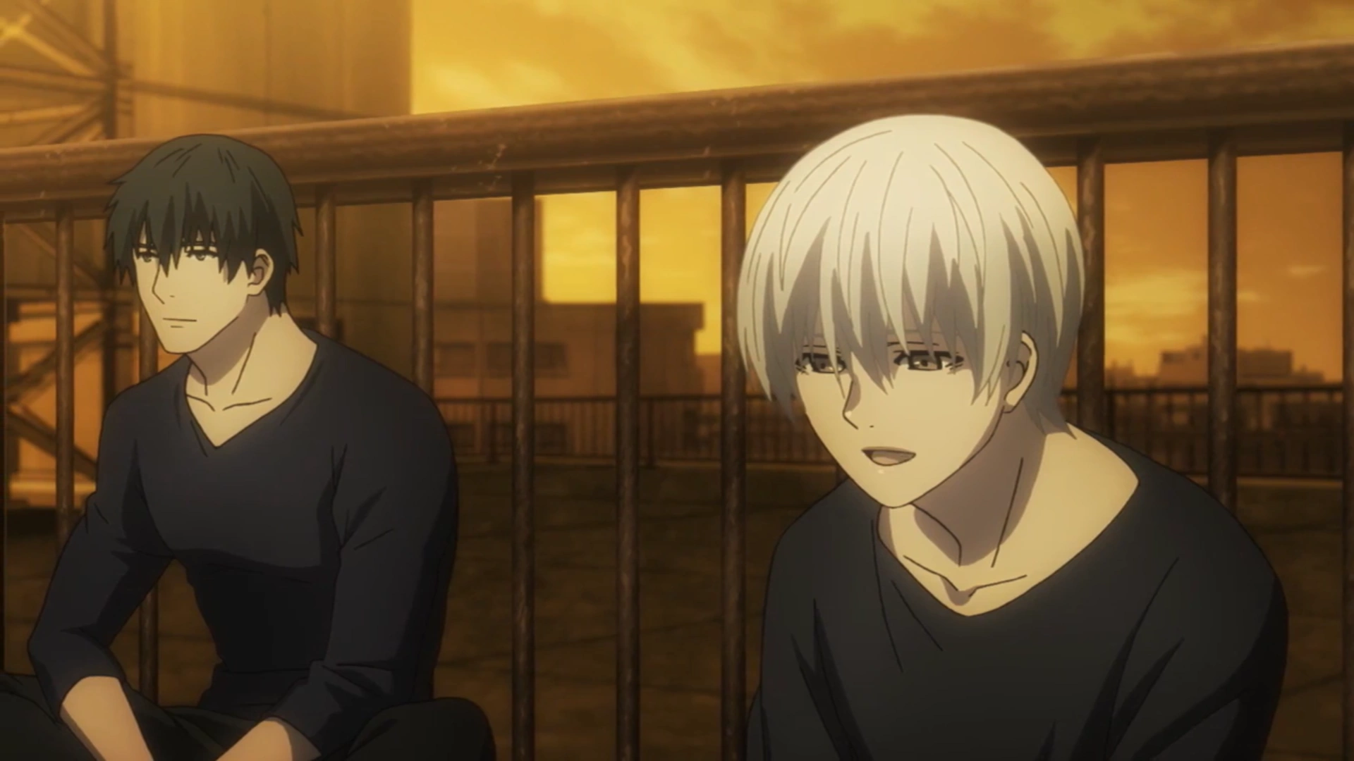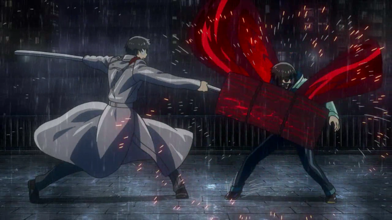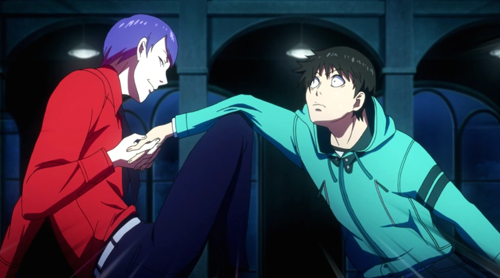 Ken lui répond qu'il ne fait pas "ami-ami" et qu'Hide est son ami d'enfance. Il se remémore des passages de sa vie avec Hide, pensant que son ami a toujours eu de bonnes prédictions quand à lui. Nishiki retire le cache-oeil de Ken et découvre alors son unique œil rouge. Ken a alors une incroyable envie de le frapper mais ne parvient pas à le toucher.