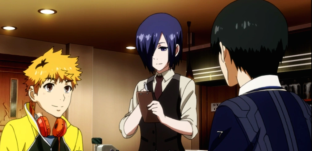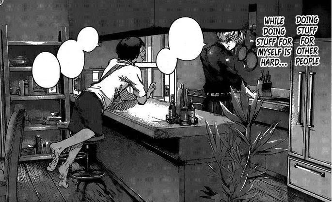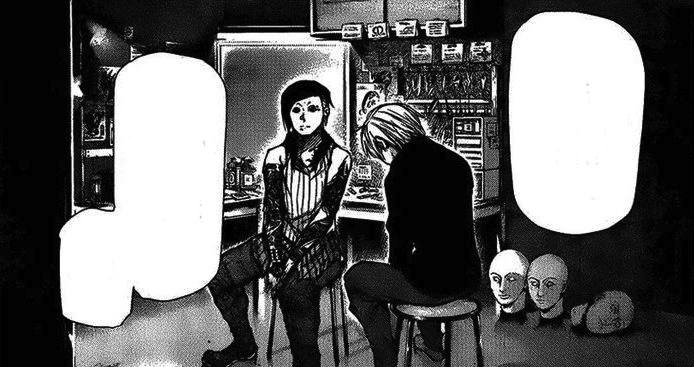 Le patron y arrivera à merveille mais quand Kaneki voudra essayer il sera à la limite de vomir et n'arrivera pas à manger. Yoshimura accompagné de Tôka lui montrera les mimiques à reproduire pour donner l'impression d'aimer. Il offrira ensuite un dé de viande à Ken pour qu'il puissent apaiser sa faim. Plus tard de jour, Ken saluera deux clientes régulière goule: Hinami Fueguchi et sa mère Ryoko Fueguchi. Toka les accueillera et leur dira d'aller voir Yoshimura elle dira à Ken qu'elle vont chercher leurs paquets. Ken s'interrogera, Tôka lui répondra que leur patron Yoshimura donne de la nourriture aux goules qui ne peuvent chasser par elle même comme lui.