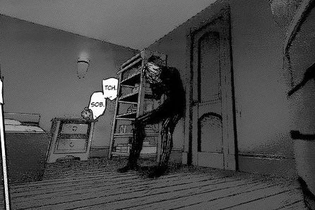 On le retrouve chez lui à terre, près de son livre L'œuf de la Chèvre Noire. Il commence à se dire qu'il est peut-être un œuf de monstre lui aussi, puis il se dit que l'organe de goule qu'il s'est fait transplanter est le coupable et qu'il n'a qu'à se le faire retirer. Il saisit un couteau et s'apprête à s'ouvrir le ventre, se disant qu'Hide viendra sûrement chez lui et appellera l'ambulance.