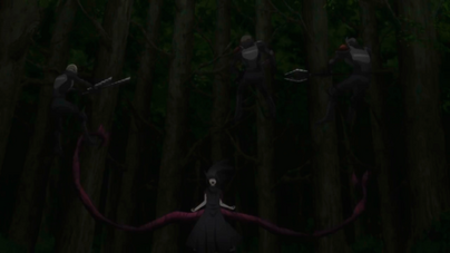C'est alors qu'un homme apparut à toute allure fonçant dans le dos de Kurona, avant qu'elle ne puisse se rendre compte de quelque chose, elle se fit transpercer, et demanda Shiro de la guérir, des tentacules vinrent difficilement connecter le haut de son corps à son bas.