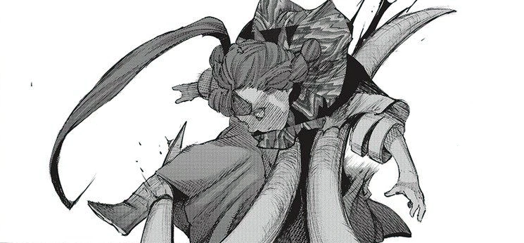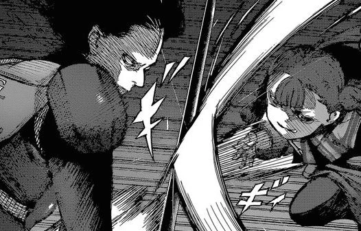Se rendant compte que l'on s'approche d'elle elle foncera voir, elle se fera alors toucher au niveau du visage, la silhouette étant en réalité l'inspecteur spécial Koori Ui venu avec une escouade d'inspecteurs. L'inspecteur déclarera à la goule qu'elle devrait se suicider étant donné qu'elle va mourir. Elle déploiera son kagune et annoncera qu'elle se battre jusqu'à son dernier souffle, Koori Ui foncera sur elle. La goule dans sa ruée vers l'inspecteur se dira qu'elle est heureuse de mourir près de Naki. Ce dernier débarquera alors et pare le coup d'Ui sauvant une nouvelle fois sa partenaire.